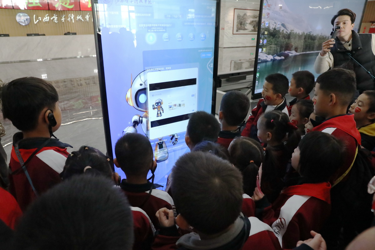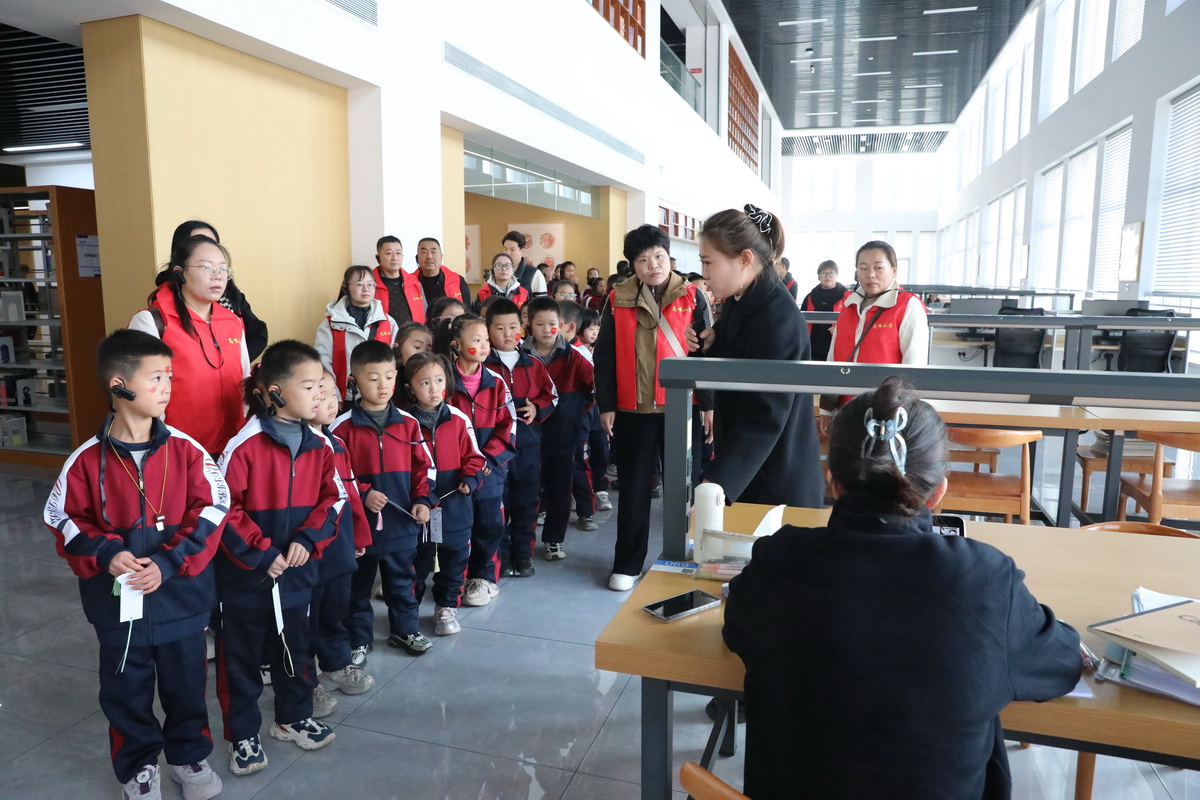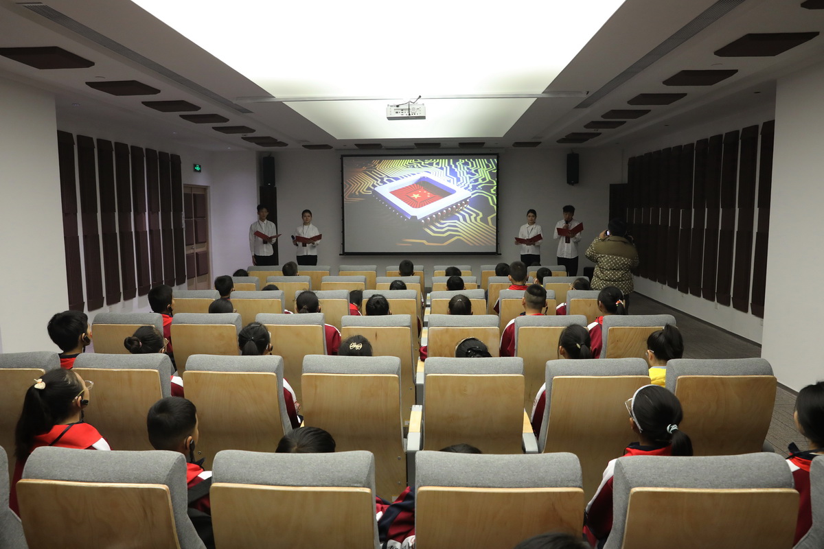 小学生们身着整齐校服,在老师与家长代表的护送下徒步抵达山西电子科技学院南门。校宣传统战部联合相关部门精心设计研学路线,从“天下第一鼓”设计原型的网球中心出发,途经印园、隐秀湖、时光长廊、劝学广场等学校标志性场地,让孩子们在自然景观与人文建筑的交融中感受大学校园文化。在印园,孩子们接过文化遗产与艺术学院精心准备的励志书签,感受中华优秀传统文化魅力;劝学广场中央,面对荀子雕像与《劝学》书卷,师生共同诵读经典片段,体悟“学不可以已”的治学精神。走到图书馆前,“书卷”造型的建筑设计令孩子们惊叹不已,在专业讲解员引导下,他们体验朗读亭、了解智能借阅系统,感受“藏借阅一体化”的智慧阅读氛围。“政”青春大学生理论宣讲团以“中国电子科技的高光时刻”为主题,深情讲述我国在半导体、人工智能等领域的重大突破,以“科技兴则民族兴,科技强则国家强”的齐声呐喊点燃全场热情。