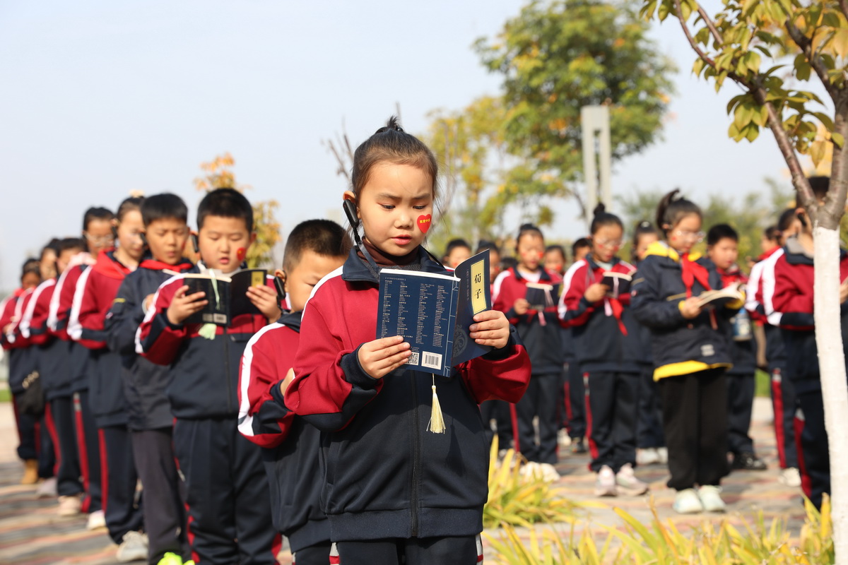 在劝学广场面对荀子雕像诵读《劝学》经典片段