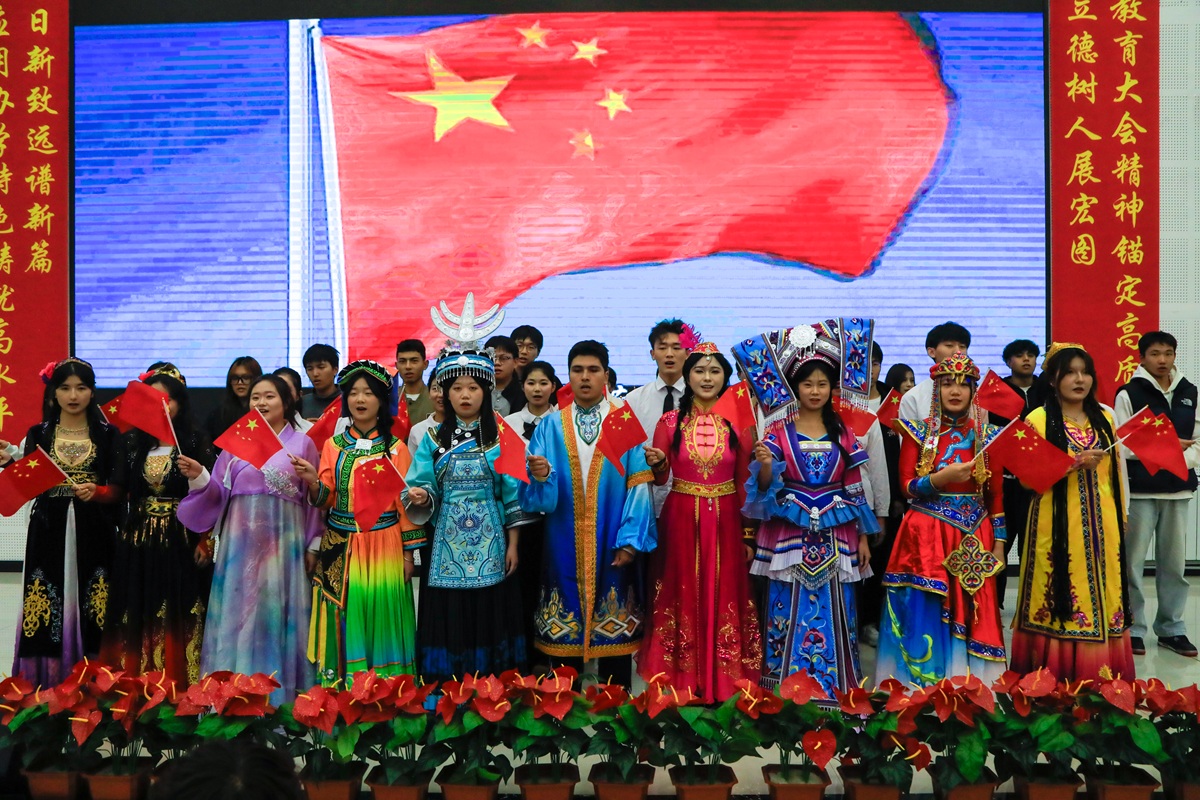 “青年的脚步走到哪里,民族团结的种子就播撒到哪里。”当宣讲团成员念出这句金句时,现场掌声雷动。宣讲尾声,少数民族学子与在场新生共同唱响《歌唱祖国》,嘹亮的歌声汇聚成青春的誓言,将铸牢中华民族共同体意识的种子播撒进每一位青年心中。